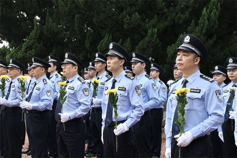 “堅(jiān)決擁護(hù)中國(guó)共產(chǎn)黨的絕對(duì)領(lǐng)導(dǎo),矢志獻(xiàn)身崇高的人民公安事業(yè)……”紀(jì)念碑前,青年民警代表領(lǐng)誓,全體民警面向警旗舉起右拳,莊嚴(yán)重溫《公安機(jī)關(guān)人民警察誓詞》。鏗鏘誓言回蕩現(xiàn)場(chǎng),彰顯出公安民警傳承英烈使命、堅(jiān)守初心使命的堅(jiān)定決心。