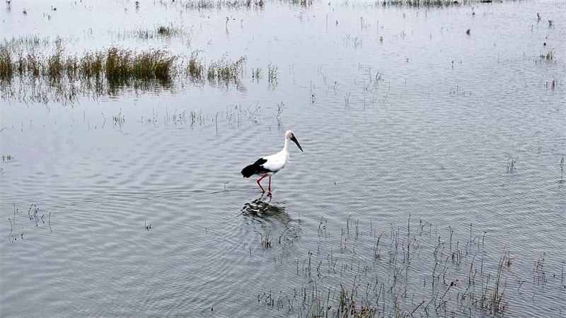 “這只東方白鸛在上空盤旋了幾圈后就落地了,然后邁著大長腿在濕地淺水區(qū)輕盈踱步,不時垂首覓食!币顺侨f洋洲國家濕地公園管理處工作人員毛祥說,“今年是連續(xù)第二年拍攝到東方白鸛的身影,這也是繼中華秋沙鴨、黑鸛、青頭潛鴨之后,在濕地公園發(fā)現(xiàn)的第四種國家一級重點保護野生動物。東方白鸛夏天在北方活動,每年十月到第二年三月會飛到南方過冬。宜城有良好棲息環(huán)境和充足的食物,所以東方白鸛在經(jīng)過時就留了下來!