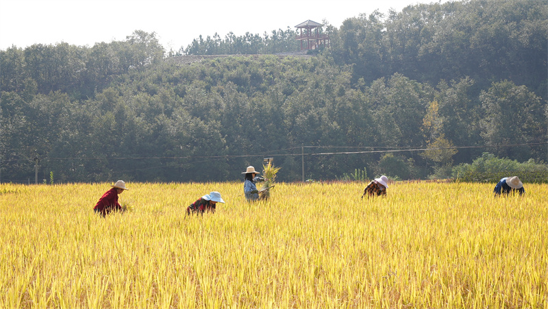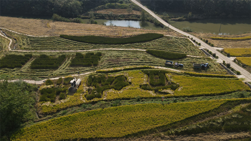 金秋十月,湖北宜城流水鎮(zhèn)的泉水稻迎來收割季,10月23日,在流水鎮(zhèn)楊棚村泉水稻種植基地,稻浪翻滾,滿目金黃,沉甸甸的稻粒壓彎了稻穗。楊棚村泉水稻種植基地四面環(huán)山,耕地多為梯田,這里的農(nóng)民因地制宜,綠色水稻使用收割機(jī),有機(jī)水稻采用手工收割,一派繁忙景象。