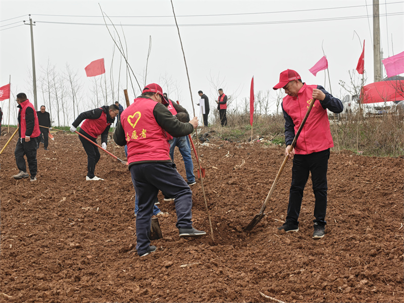 植樹現(xiàn)場(chǎng),工作人員分工協(xié)作,揮鍬挖土、扶正樹苗、覆土培實(shí),現(xiàn)場(chǎng)一片熱火朝天的勞動(dòng)景象。在大家的齊心協(xié)力下,300余株樹苗迎風(fēng)挺立,煥發(fā)出勃勃生機(jī)。