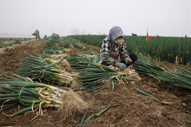 宜城市楚豐現(xiàn)代農(nóng)業(yè)種植有限公司作為小河鎮(zhèn)2022年引進的農(nóng)業(yè)企業(yè),專注于農(nóng)作物及蔬菜的種植。在聯(lián)盟村連片的蔥田里,幾十名工人正熟練地進行拔蔥、捆扎、裝車作業(yè)。自3月9日采收以來,每天有20多畝大蔥通過物流發(fā)往各地,預(yù)計一周內(nèi)可完成全部采收。