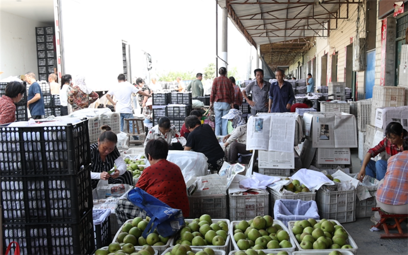 在三橋村電商基地門前,記者看到果農(nóng)們將剛剛采摘的鮮梨運(yùn)到這里集中分揀、包裝、裝車,發(fā)往全國(guó)各大城市,一派繁忙景象。