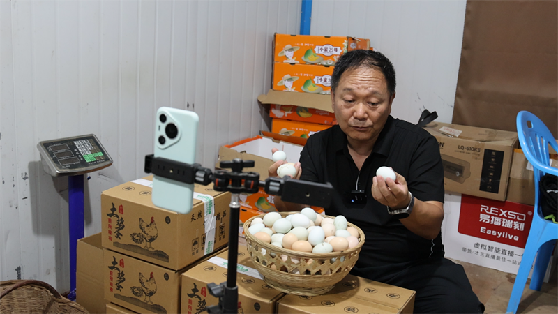 "大家看,我們的雞蛋顏色深淺不一,大小也不均勻,這是因?yàn)?走地雞'吃的是五谷雜糧。相比之下,飼料喂養(yǎng)的圈養(yǎng)雞產(chǎn)的蛋會(huì)更大一些。"不遠(yuǎn)處的直播間里,一片繁忙景象,不時(shí)傳出宏亮的直播帶貨聲。