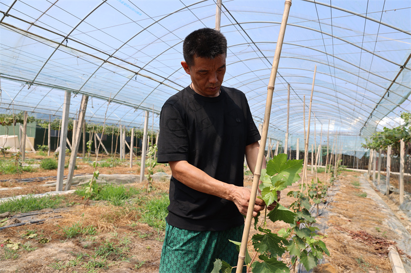 劉光寶查看葡萄新苗的長(zhǎng)勢(shì)