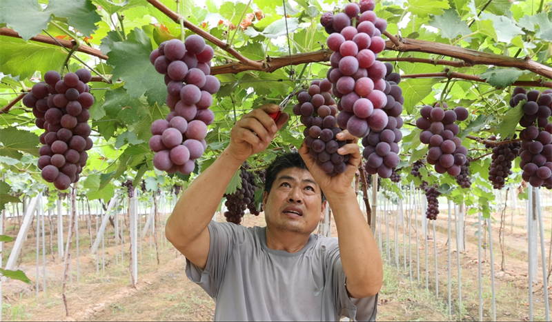 本網訊記者李勤通訊員李倩報道:盛夏時節(jié),南營街道土城村12組的葡萄陸續(xù)成熟,一串串晶瑩剔透的葡萄垂掛枝頭,空氣中彌漫著濃郁的果香。果農張廣富穿梭在葡萄架間,熟練地剪下成熟的葡萄,臉上洋溢著豐收的喜悅。