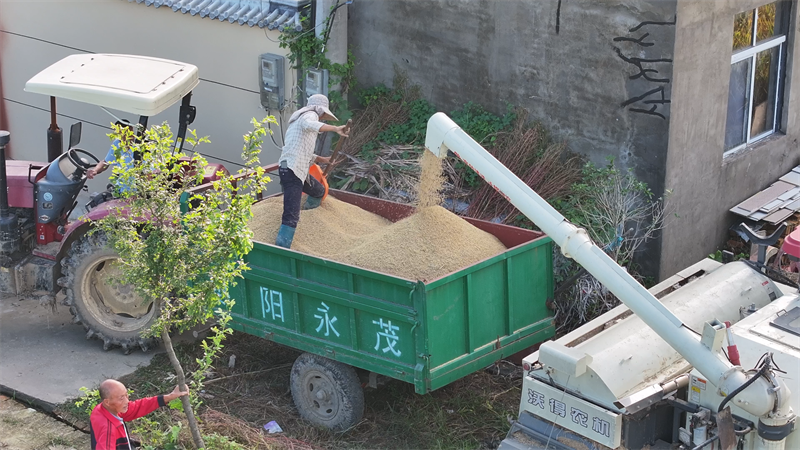 農(nóng)戶將剛收割的稻谷運送到烘干倉